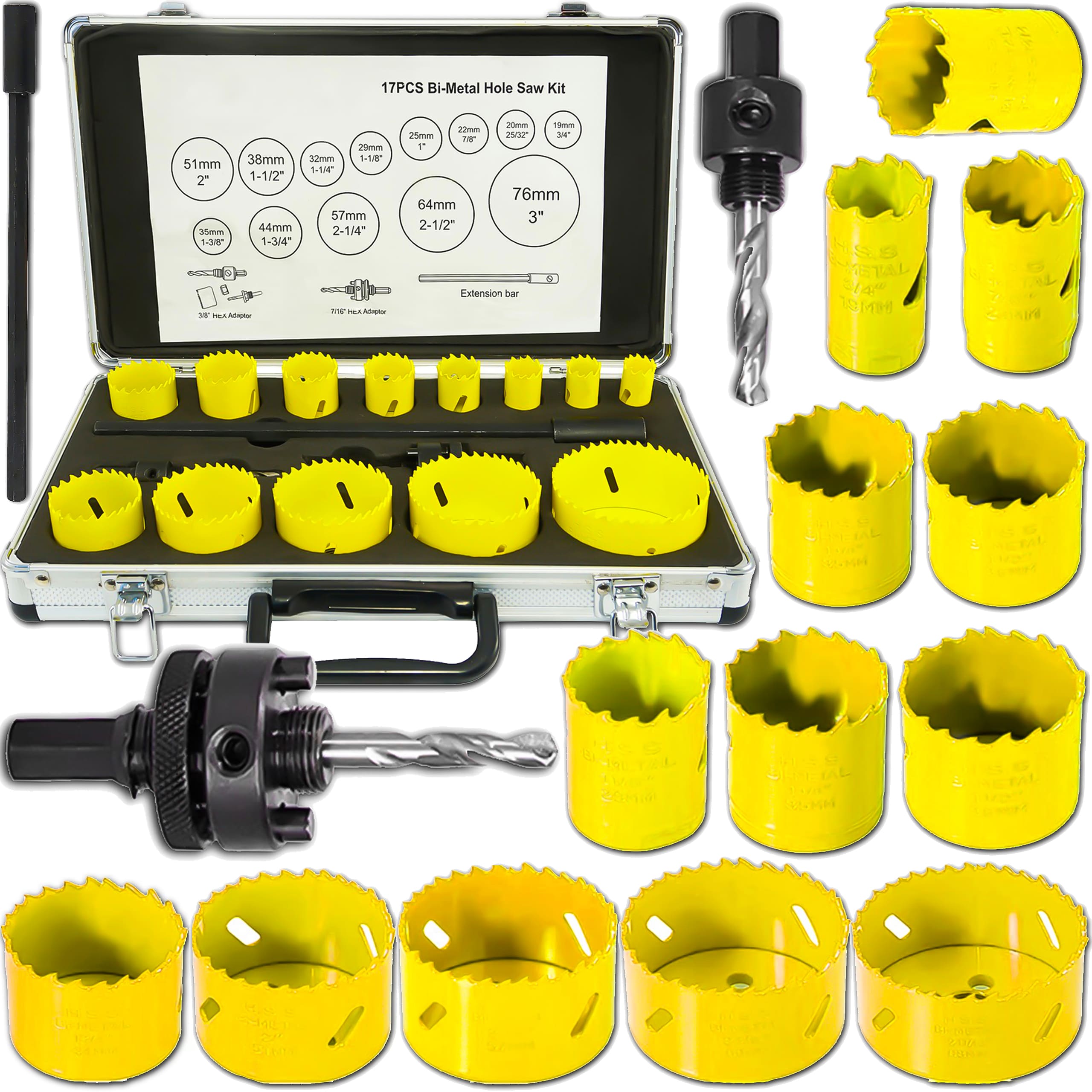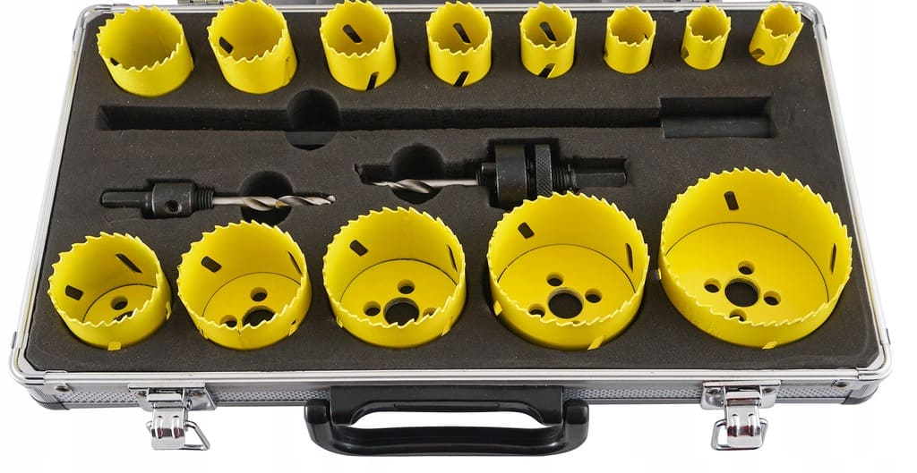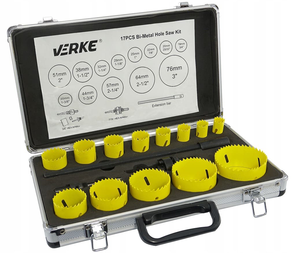 Zestaw profesjonalnych otwornic bimetalowych VERKE do wiercenia dużych otworów w metalach, blachach, kształtownikach i rurach. Doskonały także do wiercenia w tworzywach sztucznych, płytach meblowych, konstrukcyjnych płytach warstwowych oraz żywicach. Polecany do użytku zawodowego w przemyśle, serwisach oraz warsztatach, jak i w gospodarstwie domowym. Otwornice wykonane zostały z materiałów najwyższej jakości – zęby ze stali szybkotnącej HSS. Progresywny profil zębów wzmaga agresywne cięcie. Zestaw składa się z 17 elementów, całość w poręcznej walizce aluminiowej, co ułatwia transport oraz składowanie, a także zabezpiecza towar przed uszkodzeniami mechanicznymi.