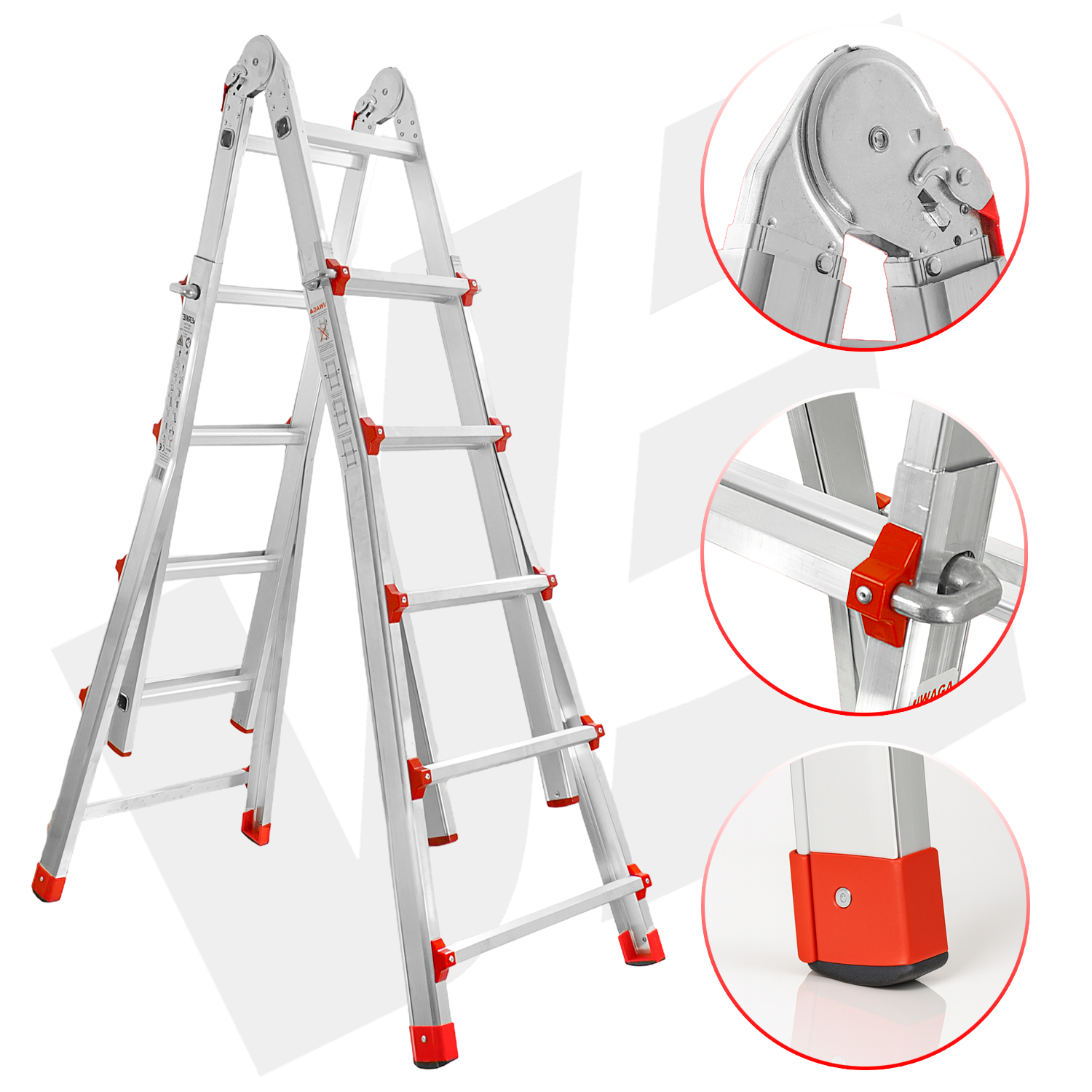 Wielofunkcyjna drabina aluminiowa z możliwością ustawienia jej w kilku konfiguracjach. Wykonana jest z lekkiego aluminium, co zapewnia wysoką wytrzymałość przy jednoczesnym niewielkim ciężarze.