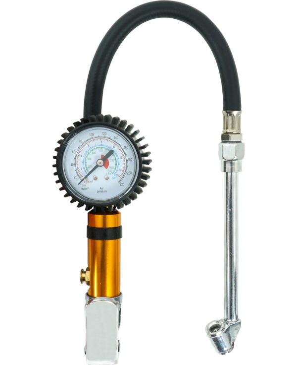 Pistolet do pompowania z manometrem służy do pompowania i kontroli ciśnienia ogumienia pneumatycznego. Posiada gumową obudowę zegara. Wyposażony jest w zawór spustowy powietrza.