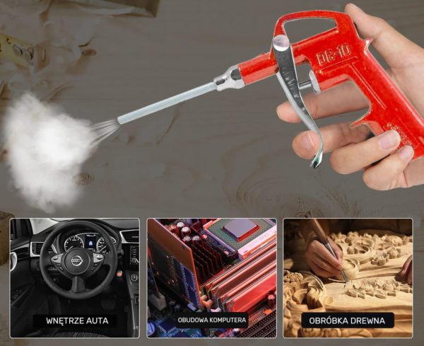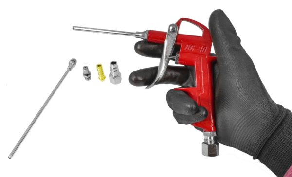 Pistolet do przedmuchiwania służy do oczyszczania strumieniem sprężonego powietrza zabrudzonych powierzchni. Dzięki długiej dyszy możliwa jest praca pistoletem w miejsca trudno dostępnych. Niezbędny w każdym zakładzie i serwisie.