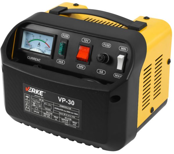 Profesjonalne urządzenie Verke Premium Line do ładowania akumulatorów 12V i 24V w motocyklach, traktorach, samochodach osobowych i dostawczych oraz łodziach motorowych. Prostownik umożliwia naładowanie tradycyjnych akumulatorów kwasowo – ołowiowych, tzw. akumulatorów mokrych. Posiada zabezpieczenie przeciwzwarciowe oraz przeciw przeładowaniu akumulatora i odwrotnym podłączeniem. Wbudowany amperomierz pozwala na stałą kontrolę procesu ładowania.